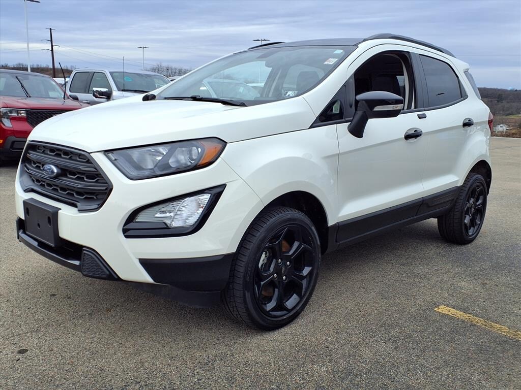 This vehicle is a 2022 Ford EcoSport SES with a low mileage of 28,789 miles. Certified pre-owned, this car has all wheel drive, a 2.0 liter I4 166hp 149 lb-ft engine, and direct injection. It has a diamond white exterior and an ebony black interior. It has a crash test rating of 4 out of 5 stars and features such as touch screen display, Bluetooth audio connection, blind spot sensor, hill start assist, on demand four wheel drive, Apple Carplay ready, navigation system with voice recognition, and leather seats. This car also has a fuel economy of 23 mpg in the city and 29 mpg on the highway. It has a crash test rating of 4 out of 5 stars and comes with a carfax report available for review. This car is sure to turn heads wherever it goes!