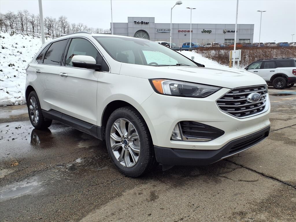 This 2022 Ford Edge Titanium is a certified pre-owned vehicle with low mileage and an all wheel drive system. It has a star white metallic tri-coat exterior and an ebony interior, making it stand out from the crowd. It has a 2.0 liter EcoBoost Turbo I4 250hp 280 lb-ft engine with direct injection, giving it an impressive fuel economy of 20 mpg in the city and 28 mpg on the highway. It also has a crash test rating of 5 out of 5 stars, making it one of the safest cars on the road today. The Edge Titanium also comes with a star white metallic tri-coat exterior, touch screen display, Bluetooth audio connection, blind spot sensor, hill start assist, on demand four wheel drive, Bluetooth phone connectivity, and leather-trimmed seats for added comfort and style. This carfax report is available for your review so you can be sure of its quality.